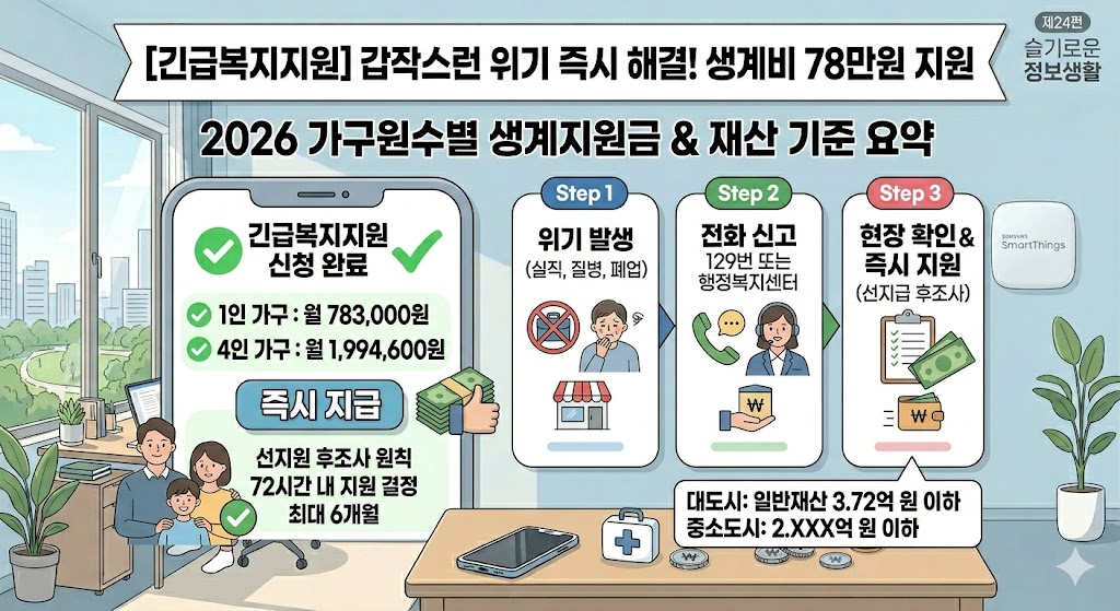 #태그 #2026긴급복지지원제도 #실직생계비지원 #사업폐업지원금 #중증질환의료비지원 #129보건복지콜센터 #긴급생계비인상 #갑자기돈없을때 #정부긴급구호 #무료의료지원 #슬기로운정보생활 #위기가구발굴 #민생안전망