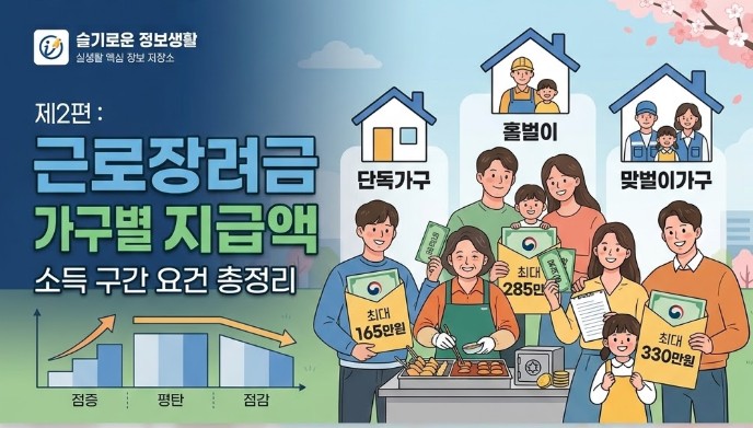 태그: 근로장려금지급액, 2026근로장려금금액, 단독가구수령액, 맞벌이가구장려금, 근로장려금계산방법, 국세청홈택스, 슬기로운정보생활, 정부지원금정리